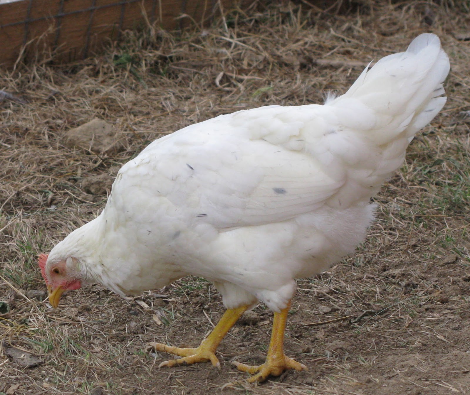 Today we had to clip Poppy's wings. Poppy is a California White. California Whites are a lighter breed so it is easier for them to fly. Poppy would fly up onto the six foot fence and get into our yard. When she is in our yard she is at the risk of being lunch to our dogs or cats. To clip wings you just clip the flight feathers on one of her wings so she is off balance and can't fly.